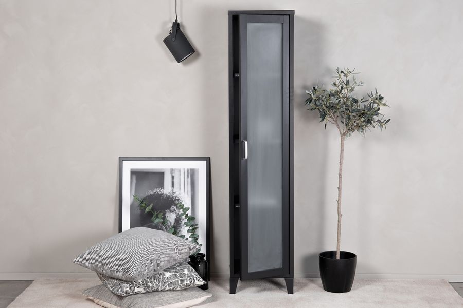 Acero, ett praktiskt vitrinskåp med smal design och ståtlig höjd! Vitrinskåpet är ett populärt tillskott i inredningen för sina smarta och snygga förvaringsmöjligheter. I det här svarta skåpet i pulverlackerad stål, flertal hyllplan och dörr med frostig finish kan du enkelt förvara alltifrån finporslinet, till böcker, till vackra dekorationer - du bestämmer! Se våra bilder för inspiration. Skåpets smala kvadratiska form gör det enkelt att placera utan att ta upp för mycket yta. Lättare montering krävs. Skötselråd: Aluminium och krom är två material som är avvisande mot smuts och vätskor. Däremot behöver man vara uppmärksam på att vatten ska orsaka fläckar och rost. Se därför till att torka av ytan med en en mjuk fuktad trasa och såpvatten. Om fläckarna eller rosten sitter för hårt rekommenderas en mjuk trasa fuktad i ren alkohol.
