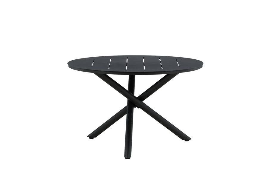 Alma – ett runt matbord i en stilren design som passar in i de flesta miljöer. Bordet är tillverkat i svart aluminium, ett robust material som står sig över tid. Skapa en charmig mittpunkt där ingen hamnar på kanten och njut av härliga stunder tillsammans med familj och vänner! Skötselråd: Utemöbler i aluminium och rostfritt stål bör rengöras regelbundet med vatten och mild tvål. Skölj alltid noggrant med rikligt med vatten, något som blir extra viktigt om möblerna är placerade på ett havsnära avstånd där salt kan transporteras via luften.