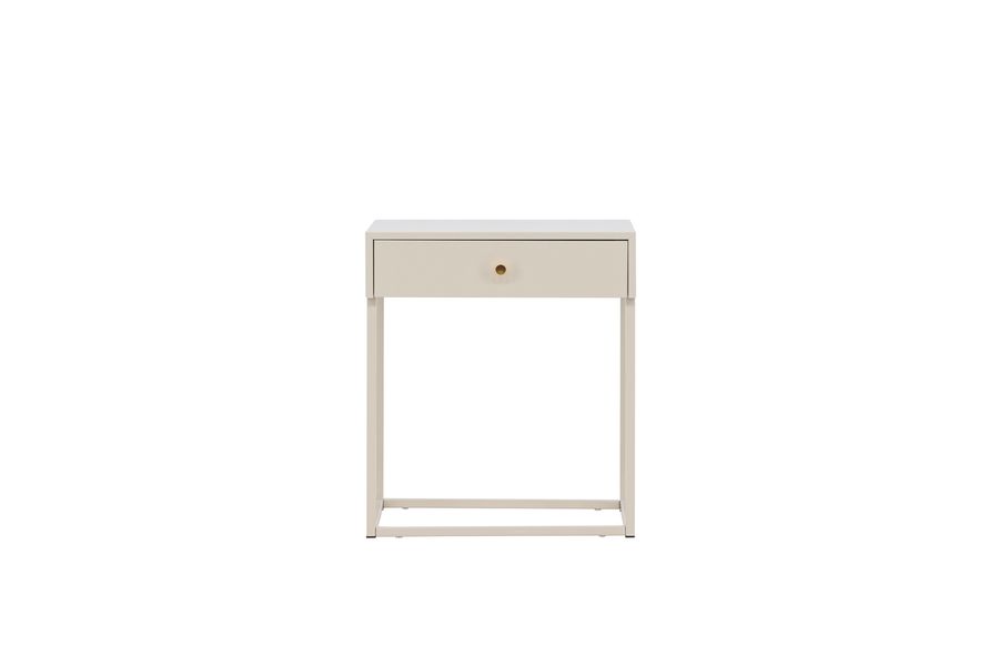 Ge ditt sovrum en modern touch med hjälp av vårt stilrena, beige sängbord i skandinavisk stil från serien Bakal! Med en magisk kombination av tidlös design och nordisk inspiration kommer detta stilrena sängbord i beige att förvandla ditt sovrum till en plats av både modemedvetenhet och ordning. Sängbordet har en smart låda för dold förvaring med en vacker mässingsfärgad knopp som blir pricken över i:et. Förvara din kvällsbok, glasögon eller småskatter på ett smidigt sätt nära till hands. Men viktigt att tillägga är att Bakal sängbordet givetvis inte bara är begränsat till sovrummet. Med sina rena linjer och luftiga form är det lika passande som sidobord i vardagsrummet eller extra förvaring i badrummet. Det skapar en harmonisk atmosfär oavsett var det placeras och blir en omedelbar förlängning av din personliga inredningsstil!