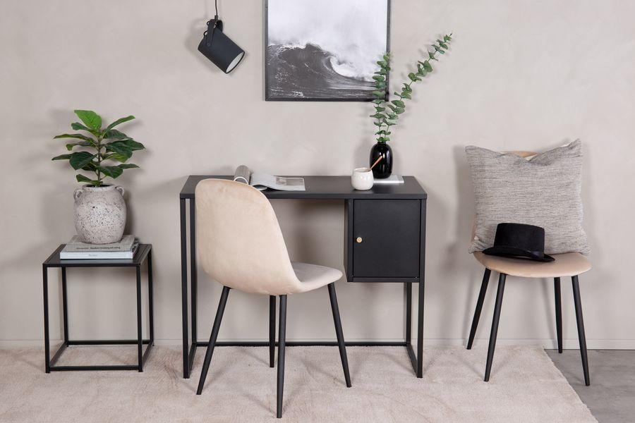 Bakal, ett nätt skrivbord i modern industriell design, integrerad ram samt ett fyrkantigt mindre skåp. En mindre dörr med dold förvaring och en avlastningsyta placerad i högra hörnet tillverkad i svart pulverlackerad stål. Dörren har en mässingfärgad knopp. Mått: Längd: 95 cm, Bredd: 45 cm, Höjd: 50 cm. Lättare montering krävs. Skötselråd: Aluminium och krom är två material som är avvisande mot smuts och vätskor. Däremot behöver man vara uppmärksam på att vatten ska orsaka fläckar och rost. Se därför till att torka av ytan med en en mjuk fuktad trasa och såpvatten. Om fläckarna eller rosten sitter för hårt rekommenderas en mjuk trasa fuktad i ren alkohol.
