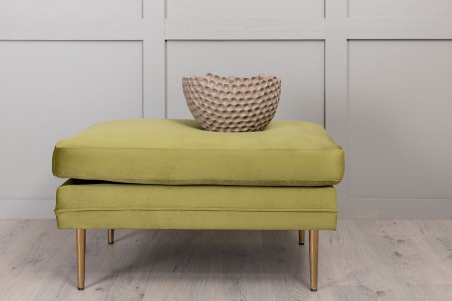Sätt tonen i vardagsrummet med en sammetslen grön sittpuff som drar blickarna till sig! Sittpuffen Boom kombinerar rak nordisk design med mjuka former och trendigt helhetstänk. Den gör sig lika bra ensam som en läcker stilikon som tillsammans med vår fåtölj i samma serie. Tillverkad i smäcker grön kulör i sammet och en ram av trä och metall. Benen är dekorativt mässingsfärgade i pulverlackerad metall och stilrent smala. Förhöj inredningskänslan i ditt hem! Puffens mått: 90 cm, bredd: 70 cm, höjd: 49 cm. Skötselråd: Sammet har en tendens till att få tryckmärken när luggen lägger sig ner. Avtrycken kan göra att tyget ser slitet ut, vilket här helt normalt för den här typen av material. Beroende på hur ljuset faller kan tyget skifta i flertalet olika nyanser.