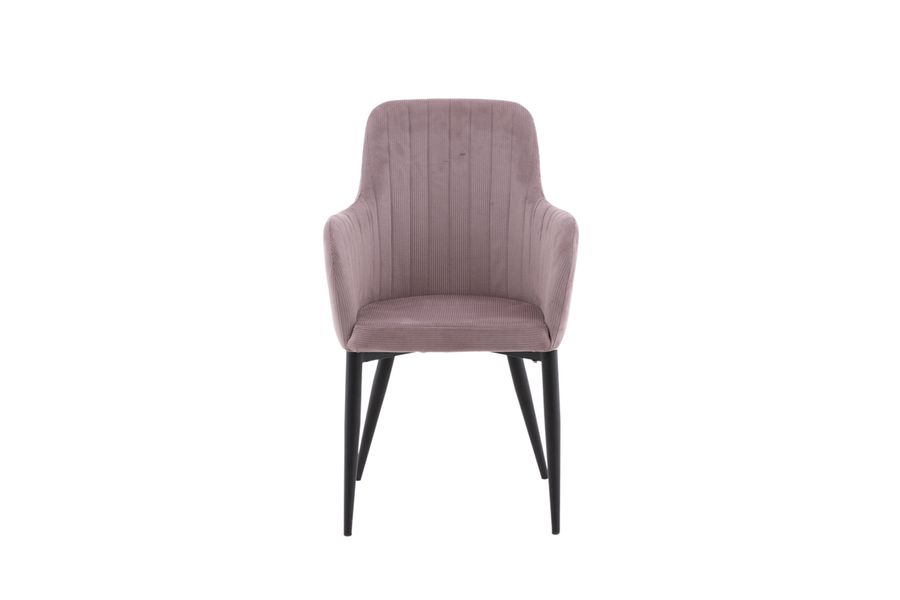 En nostalgisk manchesterstok går aldrig ur tiden! Den här matstolen från serien Comfort är klädd i lent gammelrosa sammetstyg som skapar en modern look till hemmets hjärta. Benen är i svart pulverlackerad metall och sitsen med integrerade armstöd i grått manchestertyg har en skön sittkomfort. Dekorsömmar på insidan av rygg och armstöd blir till en snygg detalj. Lättare montering krävs. Skötselråd: Använd textilspray för att impregnera textilen innan du börjar använda den, det kommer även göra att eventuell smuts och fläckar blir lättare att ta bort framöver. Ta bort fläckar med en gång, gnid inte utan försökt suga upp varsamt med en trasa.