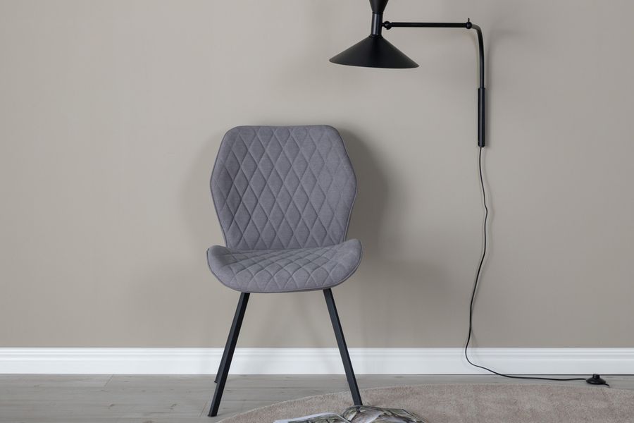 Gemma är en matstol med alla rätt - praktisk, stilren och tidlös! I en helklädd exklusiv design med ben i svart pulverlackerad metall och stoppad rygg och sits i ett skålformat utförande i grått polyestertyg får du en stol med hög komfort. Dekorsöm på insidan av rygg och sits som bildar ett snyggt rutmönster. Lättare montering krävs. Skötselråd: Använd textilspray för att impregnera textilen innan du börjar använda den, det kommer även göra att eventuell smuts och fläckar blir lättare att ta bort framöver. Ta bort fläckar med en gång, gnid inte utan försökt suga upp varsamt med en trasa.
