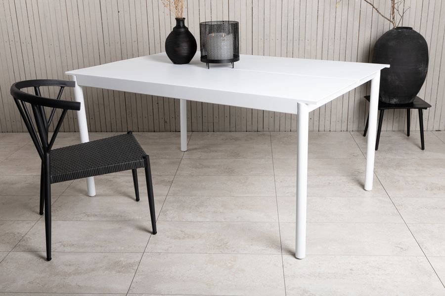 Ett snyggt och stilrent matbord för sommarens alla middagar! Bordet är gjort i vitlackerad aluminium vilket ger en inbjudande känsla till din uteplats. Ett tidlöst bord som går att använda under flera år och passar in hos de flesta. Skötselråd: Utemöbler i aluminium och rostfritt stål bör rengöras regelbundet med vatten och mild tvål. Skölj alltid noggrant med rikligt med vatten, något som blir extra viktigt om möblerna är placerade på ett havsnära avstånd där salt kan transporteras via luften. Saltet kan leda till korrosion som kan orsaka flagning eller bubblor i lacken. Tvätta inte möblerna med högtryckstvätt, ytan kan skadas av det höga trycket.