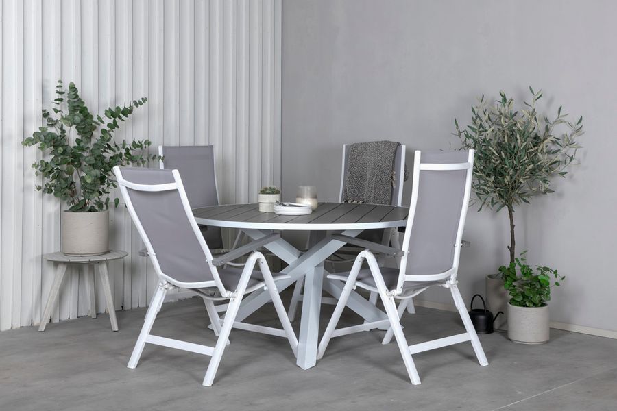 Ett runt matbord är perfekt för dig som vill skapa en trivsam, social och inbjudande känsla till uterummet eller altanen i sommar! Här får samtal och skratt flöda fritt kring ett stilrent matbord i klassisk look från serien Parma. Matbordet har en bordsskiva i grå aintwood och ett kryssliknande underrede i vit metall – Gör er redo för utelivet och låt tiden här bli dagens höjdpunkt! Skötselråd: Materialet är framtaget för att användas utomhus då det är väderbeständigt och står emot både fukt och mögel. Aintwood är därför ett optimalt material för utomhusmöbler. Undvik skador på bordet genom att använda underlägg och låta bli att placera varma föremål direkt på ytan.
