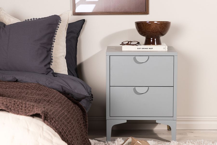Sängbord i serien Piring är perfekt som förvaringslösning! Det kvadratiska sidobordet i grått stål har två lådor för dold förvaring och stilren ovansida med lagom plats för en sänglampa, en bra bok och eventuell prydlig inredningsdetalj för modern look. Sängbordet lyfts upp av fyra ben som ger en luftigare känsla och den raka designen gör bordet lättplacerat och enkel att matcha. Se våra bilder för inspiration!
