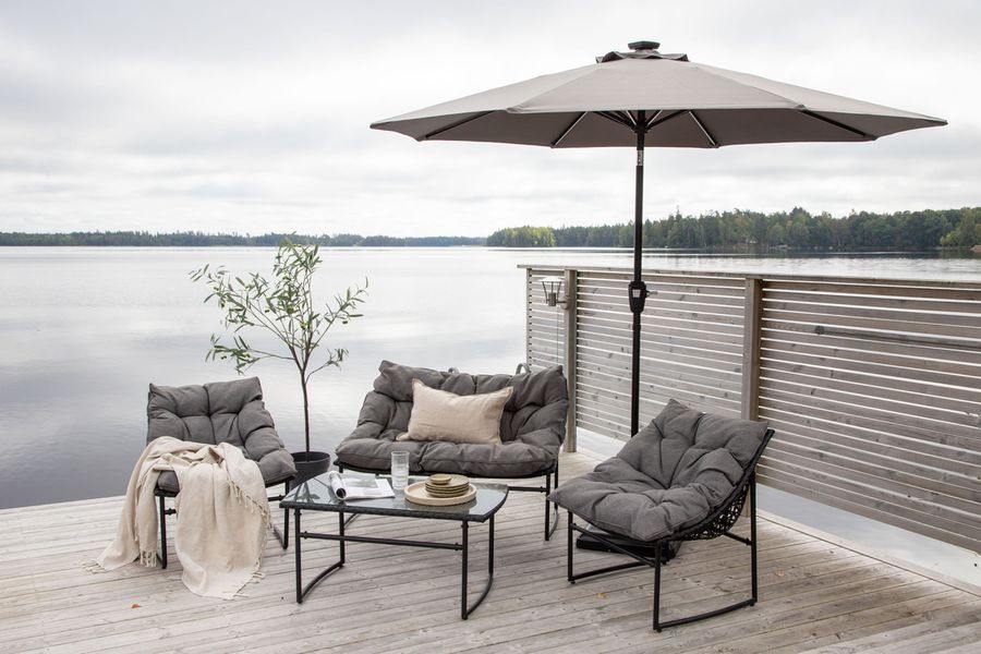 Ett fristående parasoll med grått tyg, perfekt för lata dagar i skuggan! Flytta runt det på din uteplats efter ditt behov. LED-belysningen ger ett mysigt sken på kvällarna. Mått: 270 cm Skötselråd: För våra parasoll rekommenderar vi att man använder sig av parasollskydd. Dra på överdraget när parasollet inte används, det mot sol och minskar därmed risken för solblekning. Överdraget används när parasollduken är torr, annars finns det risk för mögel. Lämna aldrig ett parasoll uppfält när det inte används. Hängparasoll är många gånger känsligare för vindar än vad traditionella parasoll (med pelaren mitt under duken) är.