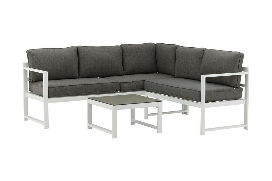 Modern stilren soffgrupp med en hörnsoffa till uteplatsen eller altanen. Tillverkad i vit pulverlackerad metall stomme med integrerade armstöd. Inklusive mjuka grå dynor och ett lågt soffbord i glas med ett granitutförande. Lättare montering krävs.