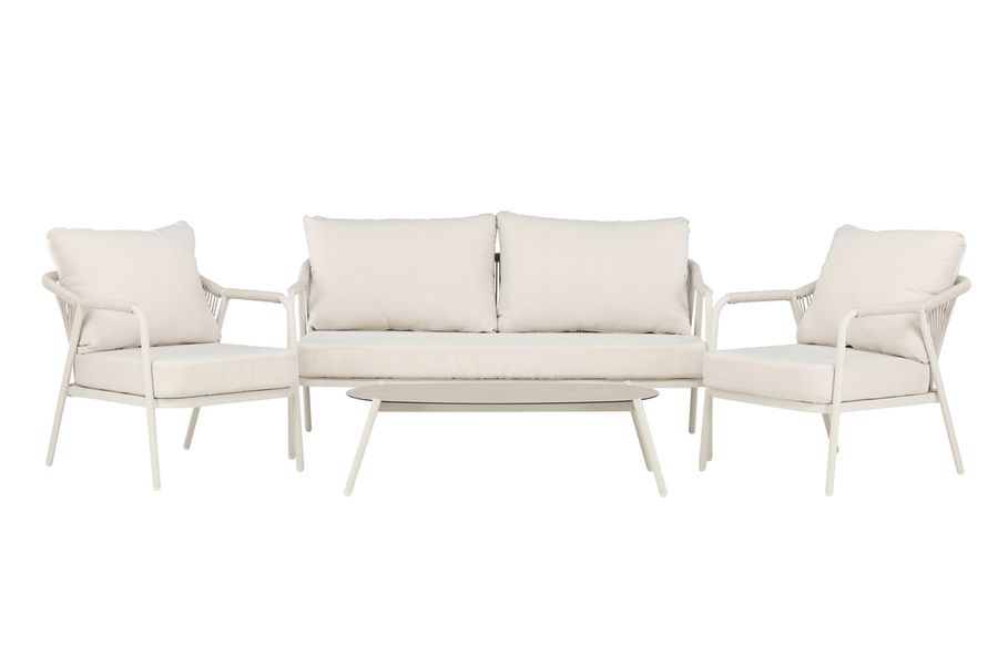 Sicily är en elegant möbelgrupp som ger din uteplats en sofistikerad och inbjudande känsla. Gruppen består av ett bord med en stilren glasskiva, två bekväma fåtöljer och en soffa – allt tillverkat av lätt och hållbart aluminium som står emot väder och vind. De mjuka dynorna i beige polyester erbjuder både komfort och tålighet, vilket gör Sicily idealisk för långa stunder av avkoppling och umgänge. Bordets glasskiva ger en praktisk och elegant yta som passar lika bra för servering som för dekorativa inslag. Med sin moderna design och slitstarka material är Sicily det perfekta valet för att skapa en harmonisk och stilren utomhusmiljö.
