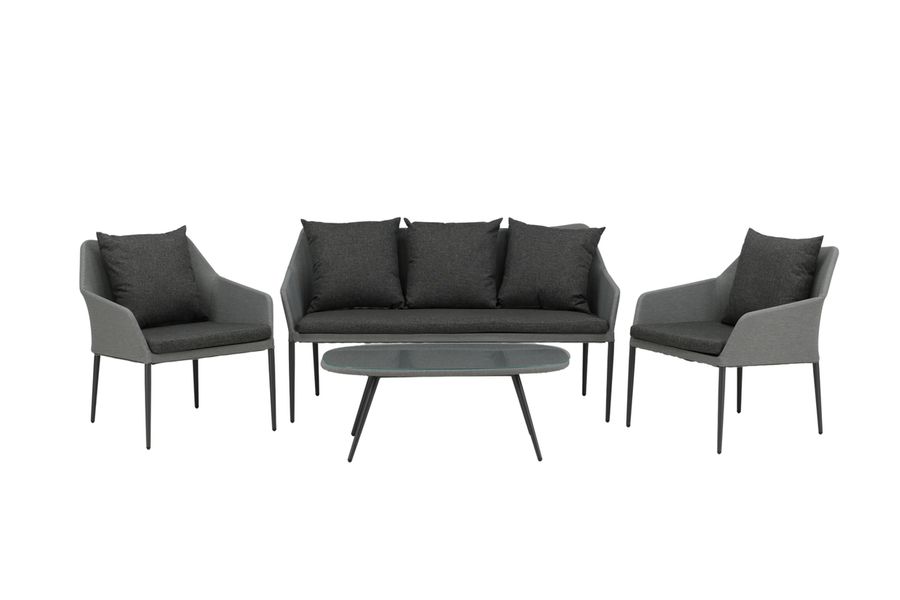 Spoga är en modern loungegrupp med inriktning på komfort – den passar perfekt på uteplatsen eller altanen. Möbelgruppen består av en tvåsitssoffa och två karmfåtöljer. Inkluderat i gruppen är också svarta mjuka dynor samt ett ovalt lågt soffbord med en bordsskiva i klarglas som skapar en exklusiv helhet. Njut av bekväma sommarkvällar i en trivsam soffgrupp!