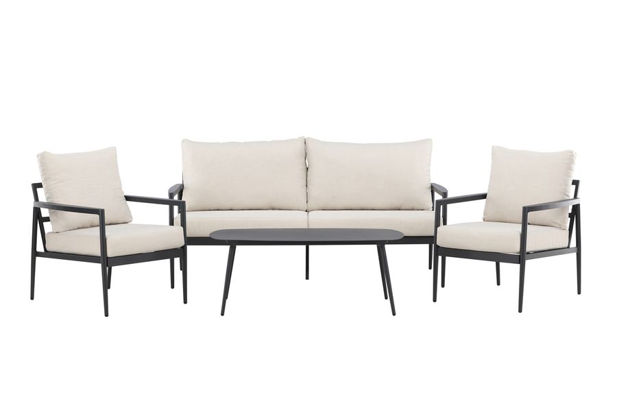 Taromina är en stilren möbelgrupp som förenar funktionalitet och design, perfekt för att skapa en harmonisk atmosfär på din uteplats, altan eller trädgård. Gruppen består av en bekväm soffa, två fåtöljer och ett praktiskt bord – allt med en ram i elegant svart aluminium, som ger en modern och sofistikerad känsla. De mjuka dynorna i beige polyester kompletterar designen och erbjuder hög komfort för långa stunder av avkoppling eller trevligt umgänge. Bordet ger en praktisk yta som passar lika bra för servering som för dekorativa detaljer. Med sin tidlösa design och slitstarka material är Taromina det perfekta valet för dig som vill kombinera stil och bekvämlighet i din utomhusmiljö.
