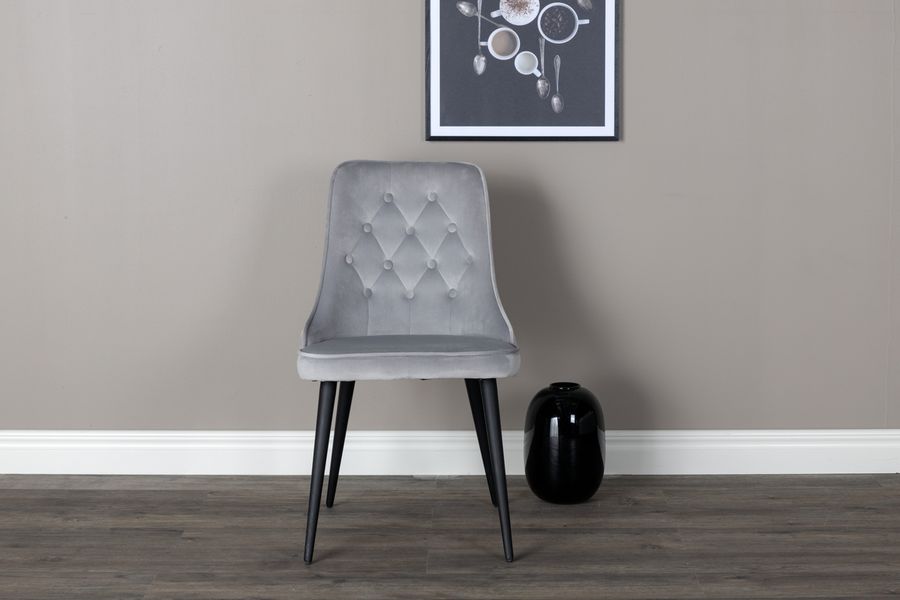 Inred hemmets hjärta med matstolar i serien Velvet Lyx för ett mer elegant blickfång i vardagsrummet! Stolen har en helklädd design i smäckert grått sammetstyg med knappar och dekorsöm i ryggen som blir till en snygg detalj. Ben i svart pulverlackerad metall och mjuk stoppning i rygg och sits för extra komfort. Lättare montering krävs. Sitt lika bekvämt som snyggt! Skötselråd: Sammet har en tendens till att få tryckmärken när luggen lägger sig ner. Avtrycken kan göra att tyget ser slitet ut, vilket här helt normalt för den här typen av material. Beroende på hur ljuset faller kan tyget skifta i flertalet olika nyanser.
